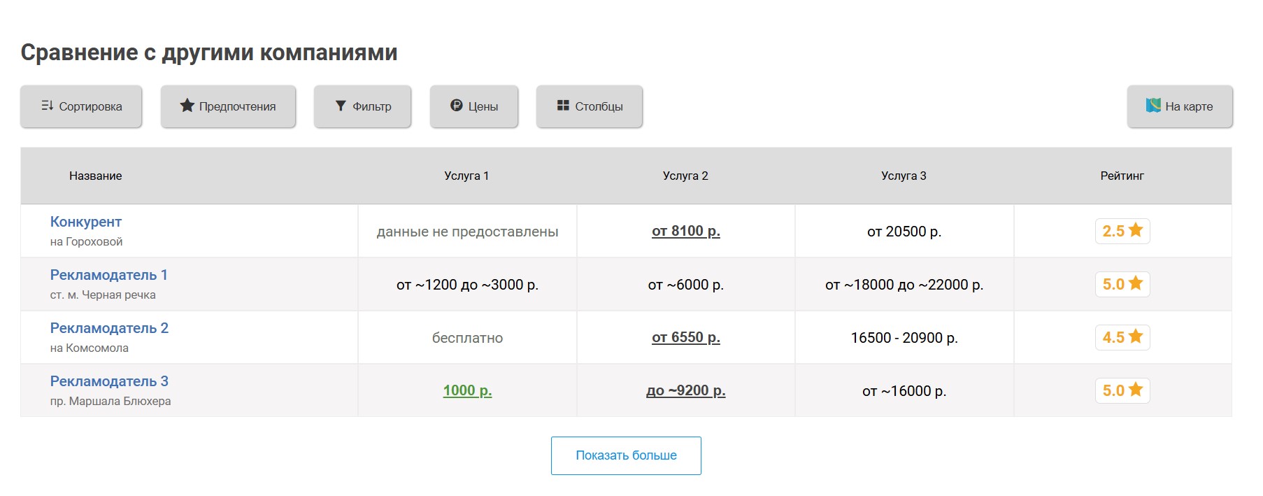 клиник, продвигаемая клиника попадёт к ним в таблицу «Сравнение по ценам», которая выглядит следующим образом: